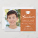 Send your family and friends a unique personalised photo graduation card featuring your custom photo on the left and to the right a white grad cap with the word "Graduate", class/year, name and other ceremony details in formal white script calligraphy to personalise on an orange background. Designed by ©Susan Coffey.