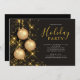 Modern elegance holiday party featuring a black background with gold Christmas ball ornaments.