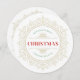A delicate gold ornate round frame surrounds the Christmas greeting. The words "we wish you a merry " in green curved text, "Christmas" in red and "and a happy new year" in green curved text. The back has text in red that reads "Wishing you and yours a wonderful holiday season and all the best in the coming year!" This text may be edited by clicking "personalise this template." There is also a place for including your family names and year.