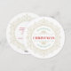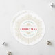 A delicate gold ornate round frame surrounds the Christmas greeting. The words "we wish you a merry " in green curved text, "Christmas" in red and "and a happy new year" in green curved text. The back has text in red that reads "Wishing you and yours a wonderful holiday season and all the best in the coming year!" This text may be edited by clicking "personalise this template." There is also a place for including your family names and year.