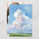This elegant wedding save the date card features a beautiful painted landscape background with blue sky, white clouds, a green field, and elegant typography. On the back is your "full-bleed" vertical photo, which can be removed if desired. It's the perfect design for a rustic yet elegant spring or summer wedding. See the collection for coordinating items.