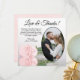 These beautiful wedding thank you cards are a wonderful way to show your appreciation to your friends and family for celebrating with you on your special day. They feature your wedding photo in an oval shaped frame with a single long stemmed pale blush pink coloured rose lying on its side reflecting in water. The title reads "Love & Thanks" with room for a custom note and signature. Classy, romantic, and sophisticated, these cards are the perfect way to conclude your wedding celebration.
