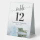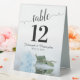 These tent signs will not only help your guests find their tables, they'll also make your wedding reception more beautiful. The design is both elegant and romantic featuring a single light powder blue or dusty blue coloured rose lying on its side reflecting in water with waves and ripples. The title is in lacy script calligraphy with bold numbers so your guests can easily find the right table. There is room for the names of the couple and the wedding date.