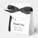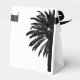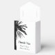 Elegant palm tree wedding party favour boxes. Tropical design with black palm tree leaves silhouette. Classy template with script typography for name of bride and groom. Perfect for exotic beach destination and summer wedding venues. Tent shape with custom colour bow. Personalise with your own thank you text.