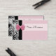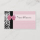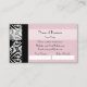 Spread the word about your awesome new business, and let client and customer help you with the friend referral custom text areas on the back, with these elegant and trendy pink and black damask pattern business cards with a girly pink ribbon. Flat printed image, not actual ribbon.