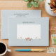 This romantic and elegant design features soft pastel roses and wildflowers in shades of blush pink, white, pale violet and gold on a light mint green background with white centre element. The background colour is also customisable.