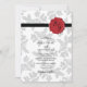 This design features elegant vintage leaf pattern and personalised wax seal image. The damask grey leaf patterned background contrasts against the black ribbon and red wax seal. The combination of grey, red, black and white colours create a sophisticated, trendy and chic style. Elegant wedding invitation design with modern elements. The simple setup of the typography gives it a distinct style. Matching wedding stationery items and other wedding invite formats are also available.