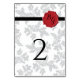 This design features elegant vintage leaf pattern and personalised wax seal image. The damask grey leaf patterned background contrasts against the black ribbon and red wax seal. The combination of grey, red, black and white colours create a sophisticated, trendy and chic style. Elegant wedding table number design with modern elements. The simple setup of the typography gives it a distinct style. Matching wedding invitations and other stationery items are also available. Customise the number and purchase each tables number individually according to how many table numbers you need.