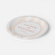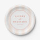 This elegant wedding plate features a minimalist design with soft peach and cream vertical stripes as the background. The central circular frame, outlined in coral, highlights clean serif typography for the names and a simple sans-serif font for the date, creating a harmonious balance. The understated colour palette and refined layout convey a sophisticated mood, perfect for formal celebrations. Customisable text allows personalisation, making it an ideal choice for memorable occasions like weddings.
