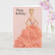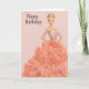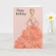 This stunning birthday card features a glamourous fashion illustration of a woman in a breathtaking peach-rose gown adorned with layered florals, shimmering details, and a romantic silhouette. The delicate colour palette and intricate textures create an unforgettable, high-fashion birthday moment.