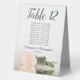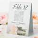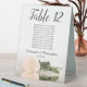 These tent table number signs are not only beautiful, they even include a list of names for the guests at each table, making it easy for your guests to find their seat at your wedding reception. The design is both elegant and romantic featuring a single sepia peach coloured rose lying on its side reflecting in water with waves and ripples. The title is in lacy script calligraphy with bold numbers so your guests can easily find the right table. There is room for the names of the couple and the wedding date.