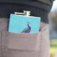 Elegant lady's flask done in a turquoise swirly pattern background, with graphics of a colourful purple and teal peacock sitting on a lavender flourish. Personalise the purple script text to suit your needs. Makes a lovely gift idea.