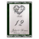 Romantic wedding themed table card features a white pearl satin background with emerald green ribbon and sparkle borders, stylish script & elegant fonts. Perfect for the simple to most elegant wedding. Also available with different coloured ribbon for your wedding theme colours. Designed to coordinate with the "Romantic Hearts, Ribbon & Sparkle on Pearl" collection. To change details, click «Personalise». To move the text or change the text size, font, or colour click «Click to customise further»
