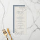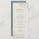 Vintage, boho, floral dusty blue wedding menu with elegant periwinkle and simple handwritten script.