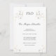 A PhD graduation party invitation with an elegant design, gold tone (non-foil) frame, white background, and black lettering. Simply add your information, add this invitation to your cart, and celebrate this major accomplishment.