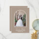 A modern custom photo beige arch wedding thank you card to send to family and friends which includes ample text space on the reverse side for you to write your own words of gratitude.