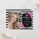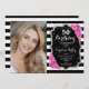Elegant floral feminine 50th birthday invitation with your photo. Glam black white pink design with faux glitter silver. Features black and white stripes, roses, script font and confetti. Perfect for a stylish adult bday celebration party. Personalise with your own details. Can be customised for any age! Printed Zazzle invitations or instant download digital printable template.