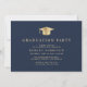 Elegant dark blue college graduation party invitation featuring a gold grad cap, the graduate's photo, their name in classic gold serif typography, and their school, major, honours or future plans. Personalise your party details on the back.