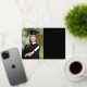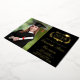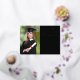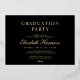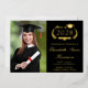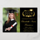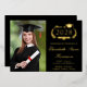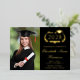 Modern black college graduation announcement and party invitation featuring "Class of" within a laurel wreath, a grad cap and a diploma, a photo of the graduate and their name, school, major, honours or future plans in an elegant real gold foil. On the reverse side, add the party details.