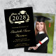 Formal black college graduation announcement featuring genuine foil (choose between gold, silver or rose gold), "Class of" in an illustration of a laurel wreath incorporating a grad cap topper and diploma, and the graduate's name in an elegant script. Add their school, major, honours or future plans in classic serif typography. Their photo fills the back of the card.