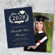 Formal dark blue college graduation announcement featuring genuine foil (choose between gold, silver or rose gold foil), "Class of" in an illustration of a laurel wreath incorporating a grad cap topper and diploma and the graduate's name in an elegant script. Add their school, major, honours or future plans. Their photo fills the back of the card.