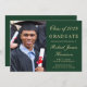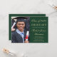 Modern and classic green and gold college graduation announcement and party invitation featuring a photo of the graduate, their name and class year in an elegant script and their university, major and honours. On the back, add the grad party details.