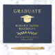 Elegant dark blue graduation party guest book with real gold foil featuring a grad cap, "Graduate" and the graduate's name, school and class year in classic serif typography. Add the grad's photo on the back.