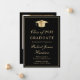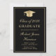Elegant black graduation announcement with a gold grad cap, the graduate's name and their class year in a formal gold script, and their school, major and honors in classic gold typography. Add a photo on the back and personalize your message.