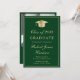 Elegant green college graduation announcement and party invitation featuring a gold grad cap, the graduate's name and class year in a gold script, and their school, major and honours in classic gold typography. On the back, add a photo and personalise your party details.