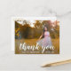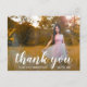 Modern graduation thank you postcard featuring "thank you" in an elegant white handwriting typography along with "for celebrating with me" in a sans serif font, over your favourite photo. The backside has your return address along with your personal message in gold over a white background. You may delete the template if you wish to handwrite your message. This simple and pretty thank you postcard is perfect for a girl graduate.