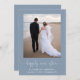 Elegant dusty blue elopement or small wedding announcement and post-wedding reception invitation. The front features your photo, "happily ever after" in a stylish white script with swashes and your names, wedding date and location. On the reverse, personalise your wedding announcement, add a reception or party invitation, input your wedding website address to create a QR code for guests to scan to RSVP online and sign your married names in a signature-like white script.