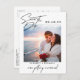 Minimalist wedding save the date announcement postcard. It features save the date typography script, single photo, names and date on the front. Personalise further with your message on the back.