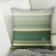 A modern design pillow featuring an elegant striped pattern in pine green with pastel turquoise colours with small rose gold lines and your custom monogram (optional).