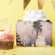 A delicate pink and black pattern with snowy hills and ethereal village buildings among elegant pink and black pine trees.