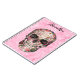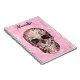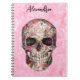 Pink skull is filled with beautiful daisies and roses. Background is a lovely pink swirl effect. Personalise with your name on the top.