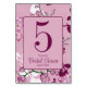 Elegant cherry blossoms a.k.a. sakura flowers, bridal shower table number card. Delicate pink flowers with modern burgundy and white cherry blossoms offset shadow. Pink background