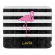 This black and white cutting board can be personalised with your custom text such as your name in faux (not foil) gold script at the bottom. A pink flamingo is above the text. The tropical bird appears on a black and white striped pattern.