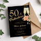 Modern faux gold trendy calligraphy script 50 and fabulous years black birthday party invitation with champagne flutes and pink beige peach roses.