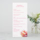 This elegant wedding menu features a vertical layout with a soft pastel colour palette of light pink and white, creating a sophisticated and inviting atmosphere. The design includes clear sections for starters, salad, main course, and dessert, each highlighted by bold headings and clean serif typography. A large, detailed floral illustration adds a touch of realism and elegance to the right side, while ample spacing ensures readability and a structured hierarchy. Perfect for formal events, this menu combines classic style with modern simplicity, making it an ideal choice for couples looking to set a warm and welcoming tone on their special day.