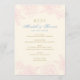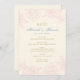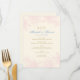 Elegant vintage inspired wedding menu cards feature a pink floral rose pattern with dusty blue and gold coloured custom text and light ivory background colour.