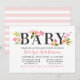 This modern horizontal baby shower invitation showcases the bold title word "Baby" crowned with lush watercolor blush, pastel pink, and peach dahlia and rose blooms with spring green foliage. Pink calligraphy script highlights the honoree's name for a soft and feminine look. The striped pink and white backing adds a playful coordinating detail. All text is fully editable to personalise for your celebration.