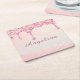 Add a touch of sparkle to your table with this elegant pink glam glitter drip square paper coaster. Designed with cascading faux glitter drips over a soft pink background and finished with a delicate lace detail along the bottom, this glam accessory brings a romantic and stylish flair to any setting. The glowing dewy finish adds a luxurious touch, perfect for entertaining, gifting, or elevating everyday dining. Personalise with a name for a unique addition to bridal showers, birthdays, or glam home decor.