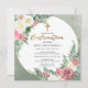 Elegant and classy pink and white rose floral with sage green greenery "Confirmation" script text design with geometric gold-toned lines circular frame.