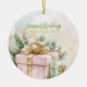 A Christmas ornament shows off a beautiful watercolor painting of an elegantly wrapped light pink holiday package. It has beautiful vintage gold ribbons, seasonal green pine accents and pine cones. A smaller mint green present is beside it. This is a lovely nostalgic image of Yuletide presents for those special people on your list.