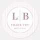 This elegant wedding sticker features a circular design with vertical pink stripes in the background, framed by a thin brown outline. The initials "L" and "B" are prominently displayed in bold serif font, separated by a vertical line, while the phrase "THANK YOU" is written below in smaller uppercase letters. The overall style is classic and formal, with a harmonious colour palette of soft pinks and muted browns, creating a sophisticated and grateful mood perfect for acknowledging guests at your special event.