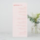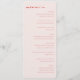 This elegant wedding menu features a minimalist design with a soft, muted pink background and coral red accents. The layout is clean and organised, with sections for Starters, Salad, Main Course, and Dessert in uppercase serif font, complemented by simple sans-serif text for the dishes. The typography is modern and sophisticated, creating a warm and inviting atmosphere perfect for a refined celebration. The overall aesthetic emphasizes clarity and elegance, making it ideal for couples seeking a stylish yet straightforward menu presentation.