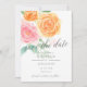 A charming and delicate floral wedding save the date announcement, with your favourite engagement photo on the back. This design features large watercolor roses in orange and pink, with green leaves, overlaid with "save the date" in grey calligraphy style font. Personalise with your wedding details in grey font.