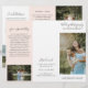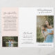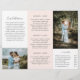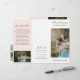 Modern photography trifold brochure featuring a photo on the front with your business name above and the brochure title below, over a white background. The outside back panel has your contact information with the header in an elegant handwritten font. The inside fold panel has a template for information along with a photo on the bottom over a pastel blush pink background. The inside has one picture on the left and right panels along with a template for information on the left, your packages in the middle and an A la carte price list on the right panel. This professional trifold brochure is perfect for a wedding photographer.