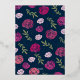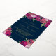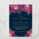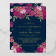Invite your guests to your wedding with this elegant gold foil invitation featuring pretty pink & purple shades floral bouquet of watercolor roses, greenery leaves, gold specks & blue background.