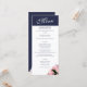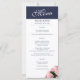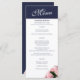 Elegant Pink Rose Bouquet Floral Wedding Menu. This modern floral wedding menu template has beautiful pink roses. The background is white and dark navy midnight blue. The text is in a modern script. You can easily customise all the text - personalise it with the bride and groom name, wedding date and your wedding menu. The back side is in dark blue colour with a rose.